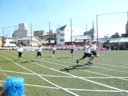 1年生にとっては、小学校での初めての運動会です。50mをまっすぐ力いっぱい走り切りました。ゴールしたあとも、もらった得点カードをしっかり得点箱に入れることができました。頑張りました。