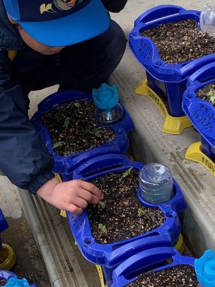遠足から帰ってきた1年生が,アサガオに水をあげるために運動場に行くなり大きな声で「でたよ!でたよ!ぼくのあさがお!」と喜びの声。「5つもでてるんだよ。」「わたしのもみてみて。」「水をやりすぎるとだめだよ。」「ちがうよ。明日の分もあげてるんだ。」「だめだって。ニュースでいってたよ。」「えーーーニュースで!」と,かわいい1年生の会話に癒されました。どんな色の花を咲かせるのでしょうね。