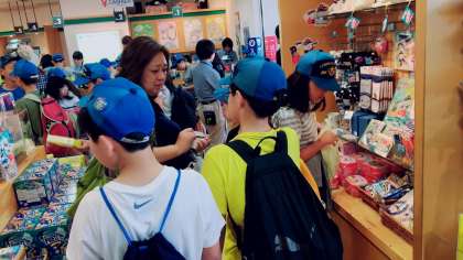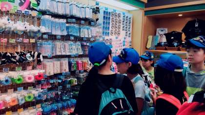 水族館でのお土産タイムです。「このぬぐるみかわいい!」「買いたいねー」「でもお金が足りない・・・」という声が聞こえてきそうです。家庭科の学習で立てたお土産計画があるそうですが,値札とにらめっこ。現実はなかなかうまくいかないようです。でもこれも旅行の楽しみのひとつですね。