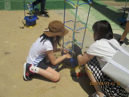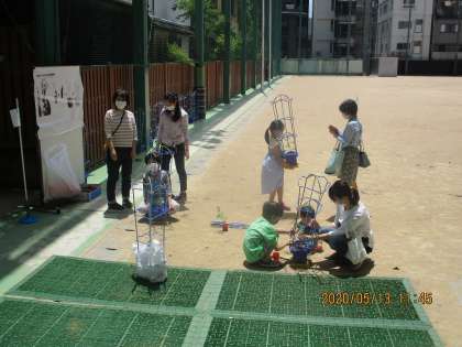 校庭で,親子でミニトマトの苗を植えてもらっている様子です。