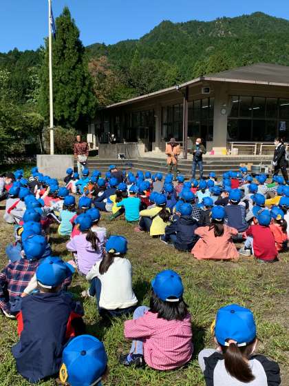 2年生は大原学舎に稲刈りに来ています。晴れ渡る大空の下、気持ち良い空気を吸いながら、子ども達は元気いっぱい活動してします。お米を育ててもらった田んぼの先生のお話を聞いた後は、いよいよ大きく育った稲を刈ります。カマの使い方に十分気を付けながら、一生懸命稲を刈っていました。自分で刈りとった稲を見ると、とても誇らしく嬉しそうな表情を見せていました。さわやかな秋晴れの下、大原の豊かな自然を体いっぱい感じることができました。