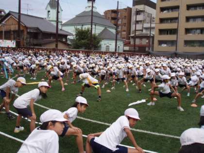音楽に合わせ,リズミカルにストレッチや跳躍を行い,体をほぐしました。競技の準備も万全です。