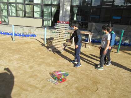 今日は,晴れた時間帯に運動場に出て,図画工作の学習で制作した作品の鑑賞をしました。太陽のもと,子どもたちが作った作品はきらきらしていました。
