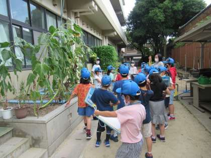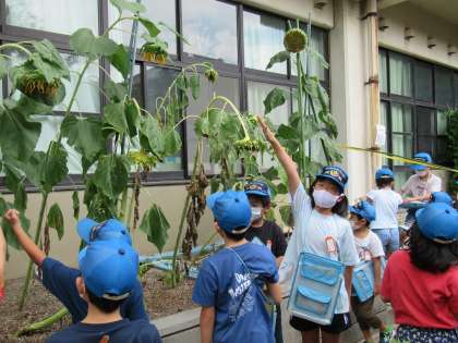 夏休みの間に背がものすごく高くなったヒマワリを見て、驚きを隠せない様子でした。花が咲いた後で、種をつくるための準備をしているようでした。枯れてしまったホウセンカが、夏の猛暑を物語っていました。