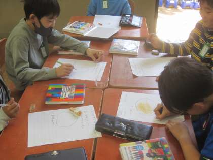 また学年の花壇には、みんなの野菜として、枝豆・ピーマン・オクラ・なすの4種類の野菜を育てています。4種類の野菜の中で、もっとも気になる野菜を選んでその種を観察し、カードにかきました。畑を見るとさっそく芽が出てきているものもあり、見つけた子どもたちがキラキラした目で「先生!芽が出てる!!」と報告してくれました。