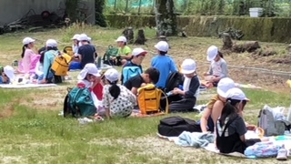 田植えをがんばったあとは、これも楽しみにしていたお弁当タイムです。2年生のがんばったご褒美でしょうか。天気もすっかり晴れてきました。