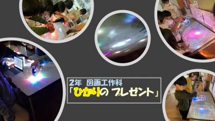 図画工作科の学習で、「ひかりのプレゼント」に取り組みました。透明なプラスチックの容器に油性マジックで模様を描き、懐中電灯で照らし、壁や床に模様が浮かび上がらせました。教室やオープンの電気を消した真っ暗な空間で、自分や友達の作った模様が壁や床に浮かびあがると、「すごい!めっちゃきれい!!」と自然と歓声が上がっていました。