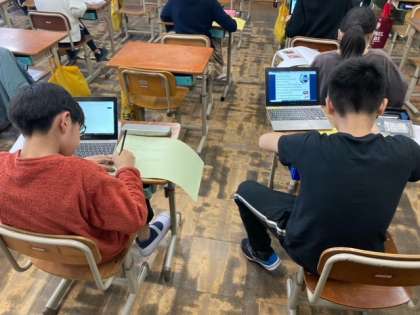 プログラミング研究所では、最後の時間に自分が作成したプログラミングを交流するために活動中です。考え抜いたプログラミングの完成、待ちきれないですね。