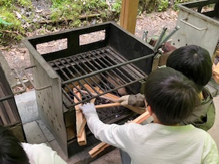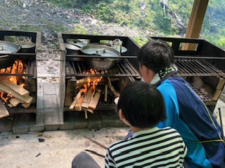 火の係、おかず係、ごはん係とそれぞれがグループで役割分担をして頑張って作っています。