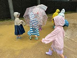 「ぴちょん」「ぽたぽた」「ジャー」というおとをみつけたり、うんどうじょうにできたおおきなかわであそんでみたり… あめのひにも、たくさんたのしいことがあることにきづいていました♪