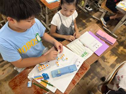 数図ブロックを使ってわり算について学習しています。これまではきっちりと割り切れたのに、何だか今回はうまく割り切れない…。「どうしてかな?」「こういうときはどうすればいいのかな?」と、疑問をもちながら解決方法について考えられています。