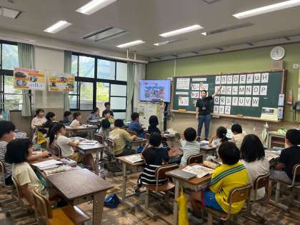 外国語活動の学習では、アルファベットについて学習を進めています。先生たちの名前のイニシャルは何かな?どんな形をしているかな?と確かめながら取り組んでいます。