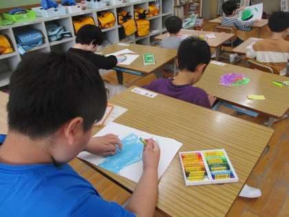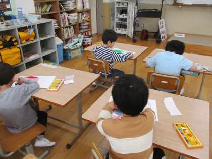 お誕生日飾りを作りました。クレパスで好きな色に塗った後、風船の形に切っていきました。色とりどりの飾りが出来上がりました。