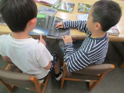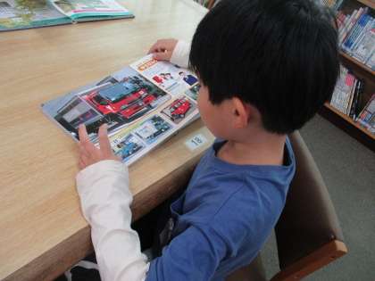 今年度初めて、図書館へみんなで行きました。早速自分の気に入った本を手に取り、読んでいました。友達と一緒に同じページを見る姿もありました。