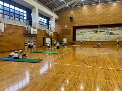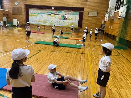 体育科の学習では「マット運動」に取り組んでいるクラスもあります。グループに分かれて、技を見合ったり、アドバイスし合ったりしながら挑戦しています!