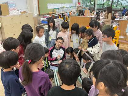 理科の授業で、4月「生きものをさがそう」の単元では、校庭に出て虫や植物をさがして、虫めがねを使い観察をしました。記録カードのかきかたを学び、自分で見つけた生きものを、色、形、大きさ、さわり心地、匂いなどを視点に、ていねいに書き込むことができました。