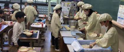 3年生から給食当番は、給食室から食缶を運び、配膳台に置いて、クラス全員分の食器の数を確認し、給食を盛り付け、一人一人に運び…といったように、食事の準備をすべて自分たちの力で行います。