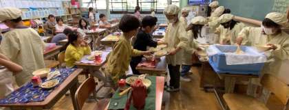給食は、みんなで食べるからおいしいのはもちろん、自分たちで協力して用意し、充実感や達成感を味わいながらいただく給食は、より一層おいしく感じるようです。みんなにこにこしながらもりもり食べています。