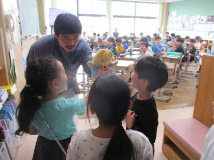 1・2年生でわくわくラリーをしました。ペアを組んで、1階から4階まで行きました。5年生は6クラスあることを看板で知り、みんなで数を数えながら確かめました。5年生の先生にも会い、お話ししてもらっていました。