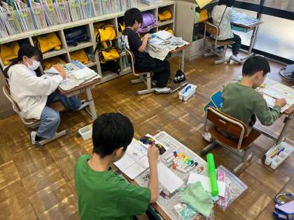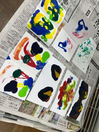 図画工作科の学習では絵の具を使っていろんな技法を試しました。デカルコマニーやスパッタリングなどいろんな技法を試していくと、その模様が何かに見えてきたり、美しい模様になったりしました。組み合わせると素敵なカードができそうですね♪