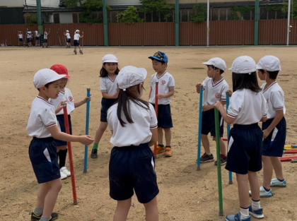 二年生では体育科「ようぐあそび」を行っています。さまざまな用具を使って、自分たちで遊び方を工夫しています。