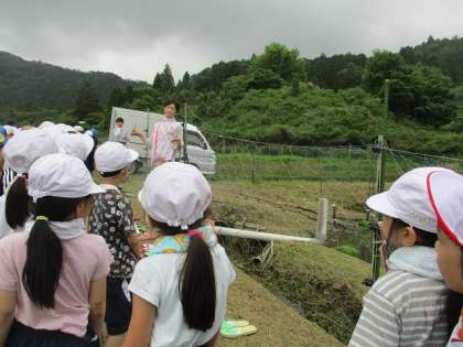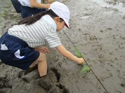 2年生と一緒に大原学舎へ田植えに行きました。お友達と一緒に、ネイチャーラリーをした後、校長先生から苗の植え方を教えてもらいました。田んぼに入り、苗を植えることができました。
