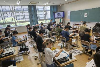 今回の書写の学習では、「湖」を書きました。初めにお手本を見ずに書いたときには、「古」の字の大きさやそれぞれの部分の始筆や終筆の位置が分からず、文字のバランスがうまく取れなかった子どもたち。そこから、お手本を見ながら何度も練習し授業時間の最後に書いた「湖」の字は、しっかりと文字のバランスが取れており自分たちでも上達を感じることができたようです。
