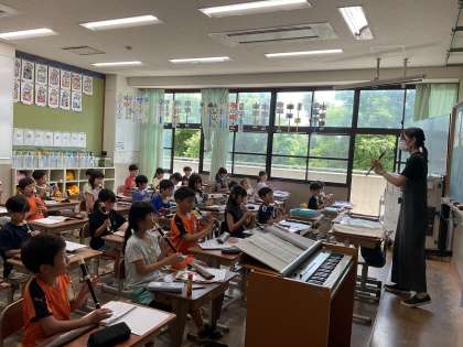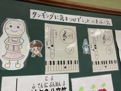 音楽科の学習では「リコーダーのひびきに親しもう」が進んでいます。1音ずつイメージキャラクターが登場するので、子どもたちは新しい音を奏でることにとても意欲的です。少しでもきれいな音色を目指して、姿勢や息遣い、指使いなどを意識して、毎時間真剣に学んでいます。