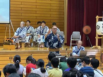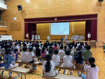 総合コミュニティかがやきの学習では、祇園祭について学習を深めています。先日はちまき作り体験を行いましたが、今回は南観音山に携わる方々に来ていただき「お囃子」を聴かせていただきました。なかなか間近で聴くことのできないお囃子の音色に子どもたちは圧倒されている様子でした。曲を聴くだけでなく、歴史や普段気を付けられていること、大事にされている想いも聞くことができました。この貴重な体験を今後の学習にも生かしていきたいね。