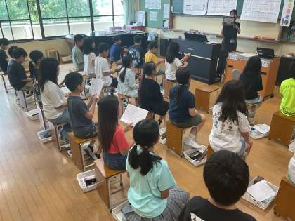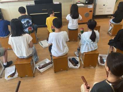 音楽科の学習では、いろんな楽器を使って合奏にチャレンジしました!ですが、歌と楽器のリズムを合わせるのは意外と難しい…。他のリズムに惑わされないように一生懸命同じグループで合わせながら合奏しています。