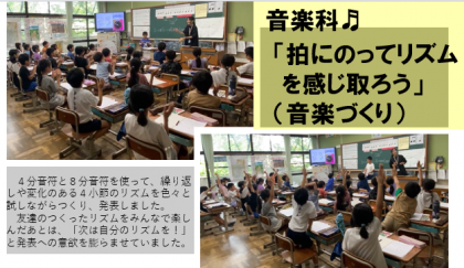音楽科では「拍の流れにのってリズムを感じ取ろう」の学習で、反復や変化を生かしたまとまりのあるリズムを作る音楽づくりをしました。音楽を形づくっている要素や構造に対する気付きが、強い思いや表現への意欲につながっていました。