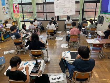 毛筆書写の学習では1学期の最後に「左右」の文字を書きました。今回のめあては筆順と字形に気を付けて書くです。子どもたちは素晴らしい姿勢で、集中して書いていました。小筆も上手になってきたね。2学期もまた頑張りましょう!