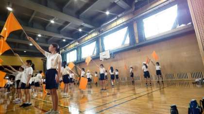スポフェスで披露する予定のフラッグの練習に今週も取り組んでいます。今日は、1人でする技から2人で掛け合いをしながらする技へとレベルアップしました。子どもたちは、フラッグの演技をするのが毎回楽しみなようで、振りを覚えるのもとても早くて驚かされます。
