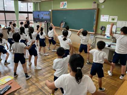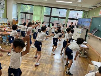 スポーツフェスティバルに向けてソーラン節の練習をはじめています。こしを落とすところやうでを回すところなど力強い動きがたくさんあります。難しいところもありますが、少しずつ覚えてきています。かっこよく踊れるようになっていこう!