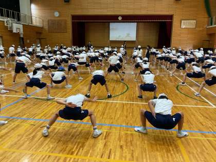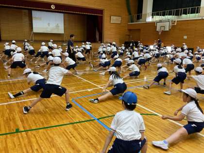 スポーツフェスティバルに向けて、各クラスソーラン節の練習をしてきました。今日は初めて4年生みんなで集まって練習しました。学年全員がそろうと迫力があり、一気に気合が入ったように感じました。細かい動きも確認しながら練習していこう!