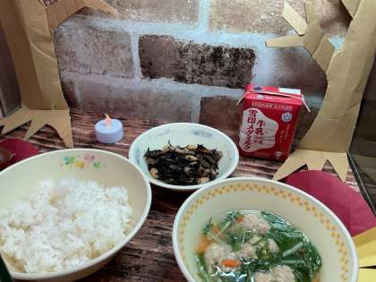 今日の給食に「水菜とつみれのはりはり鍋」が登場しました。