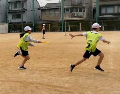 体育「リレー」の学習では、自分たちのチームのタイムを縮めるためにはバトンパスが大切だということに気付き、バトンのもらい方や走り出すタイミングなどを工夫しチームで相談し合いながら練習しています!ベストタイムが出たときには大喜びの子どもたちです。