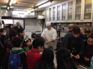 4〜6年の20人余りの児童が参加しました。厨房に案内していただき、京料理に込められた思いや江戸時代から大切に使われている道具を教えていただきました。