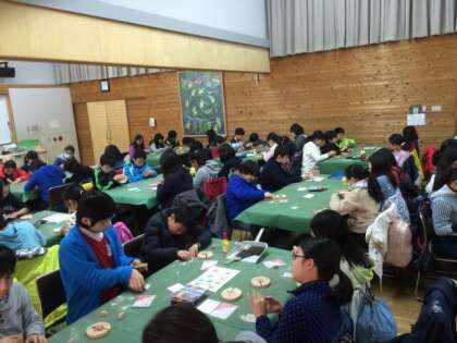 半分のグループがオリエンテーリングで歩き回っているなか、館内では写真立て作りを行いました。