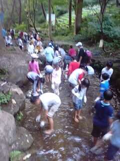 昼食を食べ、2時20分からオリエンテーリングです。地図を持って、班ごとに出発。初めての場所なので、地図をじっくり見ながら進みました。急に雲行きが怪しくなり、あとから出発したグループは途中で引き返しましたが、半分のグループがゴールしました。次は魚つかみです。素早い魚を必死に追いかけていましたがなかなかつかまりません。「わー」「きゃー」と歓声を出しながら活動していました。元気いっぱい活動しています。