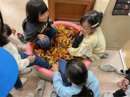 オープンに各クラスの秋の宝物を持ち寄りどんな風に「秋のもり」をつくるか考えていく中で、「種類に分けて置くと嬉しいんじゃないかな」「綺麗に並べると気持ちいいと思う」と秋さんのことを考えて話してくれました。