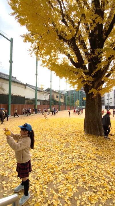 その下には、まるで絵本の世界のように、葉っぱの絨毯が広がりました。休み時間、子どもたちはその恵みを両手にすくい、夢中になって葉っぱを集めたり、ふわりと舞う葉を追いかけたり・・・。