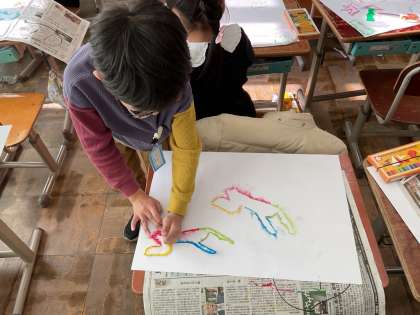 強くこすって輪郭をはっきりさせたり、いろいろな色を使い色鮮やかな生き物にしたり、様々な工夫をしている姿が見られました。