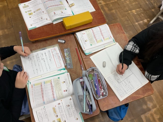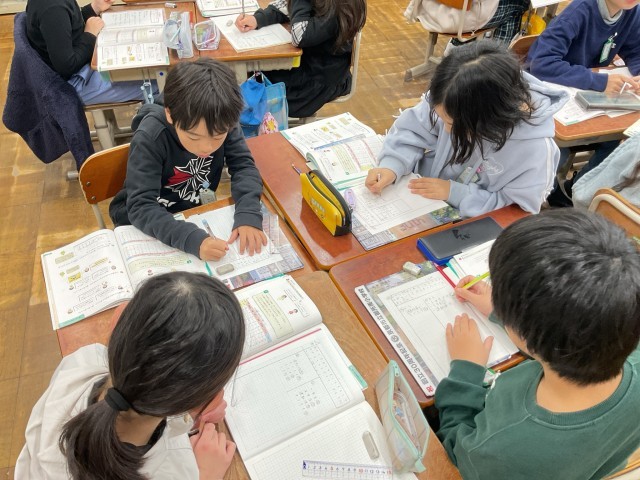 算数科の学習では、「調べ方と整理の仕方」を進めています。けが調べについてまとめた2つの表からはどんなことが読み取れるでしょうか?班で話し合いながら、「○○では、すりきずのケガが多いよ」「◯年生が少ないね」など、読み取っています。
