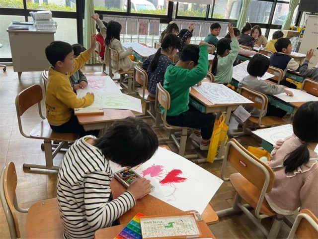 1年生の「せんのぼうけん」の学習に交流に行きました。担任の先生の説明を聞き、お気に入りのクレパスを選んでいざ線の冒険へ!