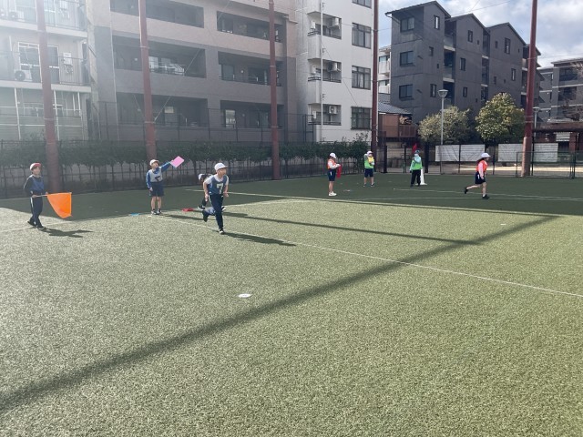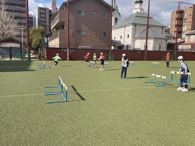体育科では「小型ハードル走」に取り組んでいるクラスもあります。トン、1・2・3のリズムを意識しながら跳んでいます。準備や片付けもみるみるうちに素早くなり、インターバルを合わせるのも自分たちで合図を出し合うことができています。すばらしい!
