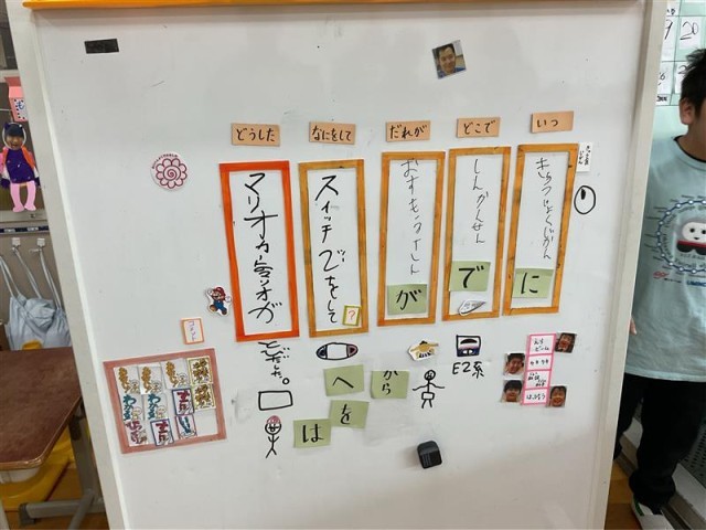 「へんてこ作文」では、グループで作文を作っています。助詞の使い方も上手になっていき、面白いオチを考え出す子どもたちも出てきました。