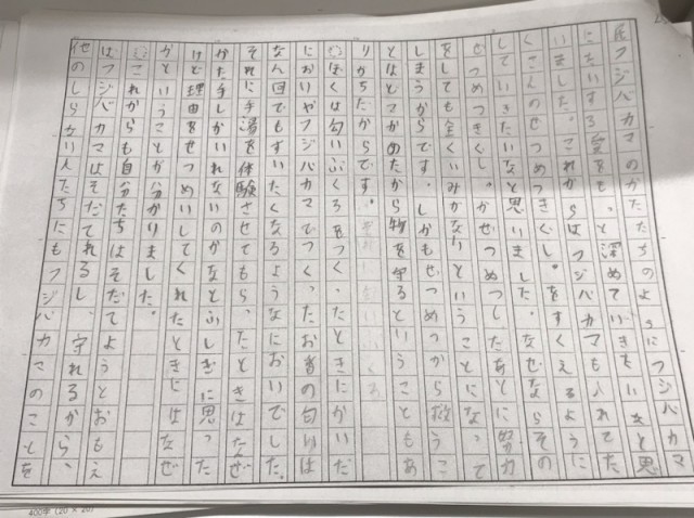 書き始めた瞬間、教室の空気が変わりました。鉛筆の音、ファイルをめくる音だけが響く静けさの中、目の前の子どもたちはまるで自分の心と対話するように、丁寧に、真剣に文字を紡いでいきました。その姿は、感動した体験や乗り越えてきた経験が、ひとつひとつ言葉となってあふれ出してくるようで、その集中力は、教師である私も思わず息をのむほどでした。