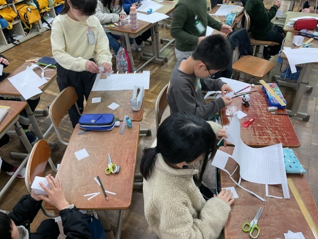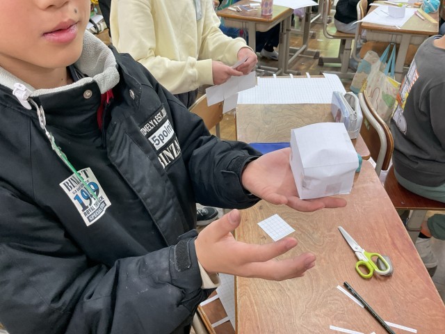 算数科の学習では「直方体と立方体」の学習を進めています。学習のはじめは、方眼紙を使っていろんな形の箱を作ることで、箱の面の形や数に目を付けることができました。これからどんどん形について調べていこう