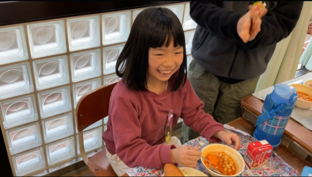 やがて「いただきます」の声が響き、教室が静けさに包まれます。子どもたちはそっとお椀の中をのぞき込み、ほんの数秒、呼吸をとめたような緊張感が流れました。